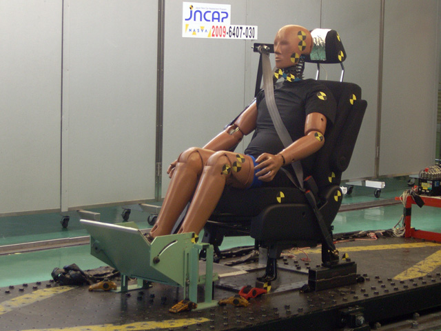 後面頚部保護性能試験は、実際の追突事故を模した衝撃をスレッド試験機に取り付けた対象車種の座席(ダミー搭載)に与え、頚部に受ける傷害値を測定するもの。この試験は今年度から導入した最新の評価項目で、乗車中の死亡者が減少する一方で、むち打ち症など頚部傷害に被害が集中する傾向にあることから実施することにした。追突時における座席の傷害保護性能を評価する。