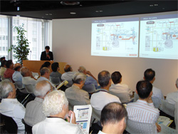 「クリーンディーゼルの最新動向」と題し,パワーポイントを用いて(1)マーケット情報(2)ディーゼルエンジンの進化(3)CO2低減(4)コモンレールシステム?排気後処理装置―を内容とする配布資料に沿って解説されたが、各項目とも充実した内容であり、クリーンディーゼルの優れた点が理解できた。ボッシュは2004年から日本でディーゼル車の普及促進活動を展開していることもあって、難解なディーゼルエンジンの制御をCG(コンピューターグラフィック)による動画で解り易く解説した資料が用意されるなど、その意気込みが感じられた。