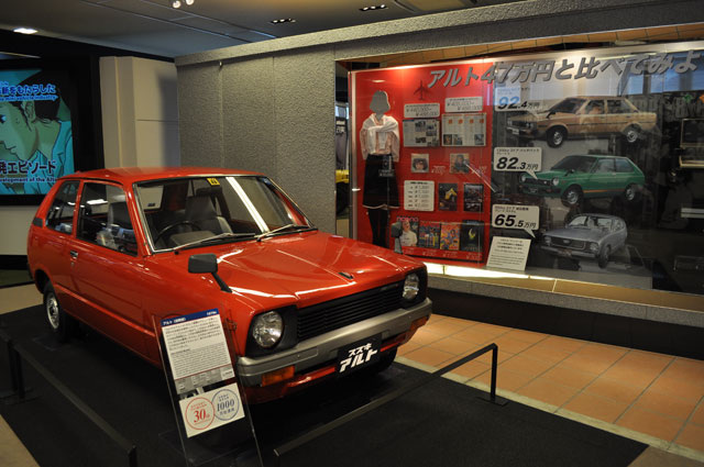 1979年に登場したアルトは、47万円という破格のプライスが消費者に大歓迎され、以来30年間で1000万台を世に送りだすヒット製品となった。その47万円がどれほどの衝撃であったのか、当時の乗用車はもちろんレコード、雑誌そして家庭用VTR(当時はまだテープ記録だった)やパソコンといった製品と比較すれば確かに容易に想像がつく。日常的な生活のなかで果たした(そして現在も果たしている)軽自動車の役割を改めて思い知らされる展示になっている。