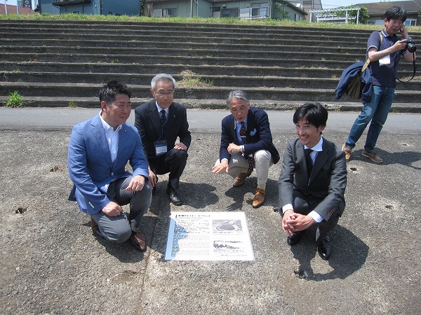除幕されたプレートを囲む福田川崎市長、日本クラシックカークラブの山本英継氏、堺正章氏、小林大樹氏。