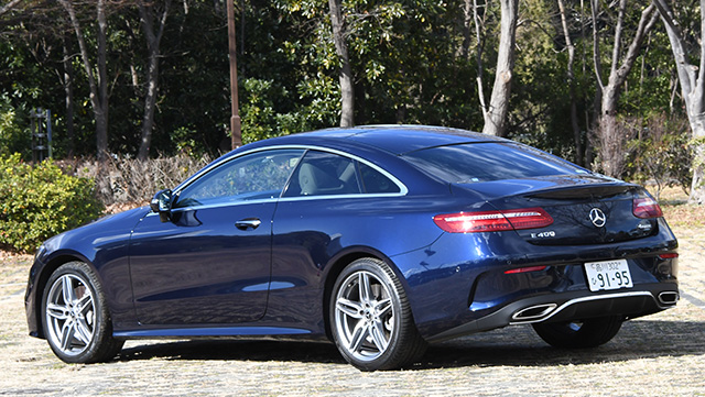 ボディサイドの造形もスムーズで、なかなか新鮮な印象だが、Eセダンやほかの各モデルにはあるショルダー高さのプレスラインがクーペにはない。メルセデスの最も新しいデザインだという。近年のメルセデスは、ほかのブランドよりもシンプルで有機的な曲面のデザインが目立っているが、それをさらに極めようというわけだ。