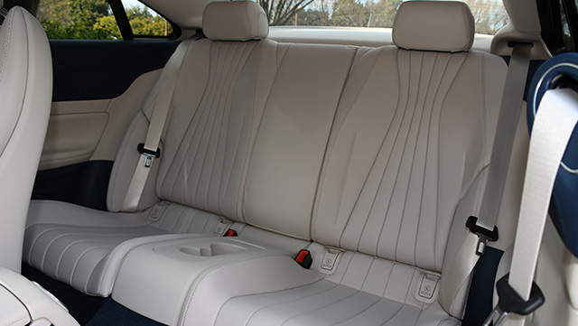 先代のEクラス クーペは後席が狭かったが、新型はホイールベースが伸びて後にしっかり2人乗れるのが売り。全長4855mmなら当然ともいえるが、この美しいルーフラインを4名乗車で実現するにはそれくらい必要なのだろう。