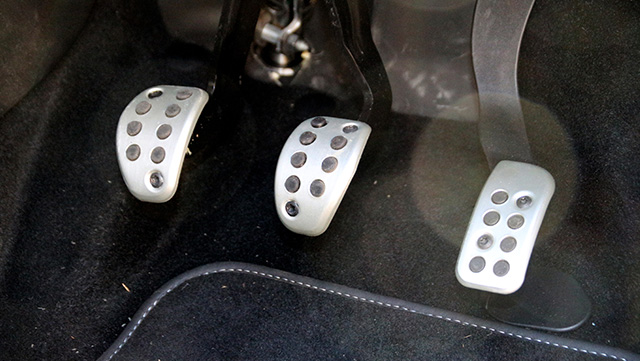 ストロークも大きめで軽いタッチで効いてしまうので、ヒールアンドトーはやりづらい。疑問に思ったのはペダルの形状だ。滑らないようにペダルに穴を開けてゴムだか樹脂をはめているのだが、ブレーキとクラッチのペダルは湾曲しているので靴底を面でなく線で受け止める格好になる。実際ヒールアンドトーをやろうとしてペダルから足が横に滑ってすっぽ抜けた。凝っているのに裏目に出ている。