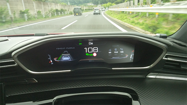 走りだすと308に較べ一回り大きくなったボディーだが、その大きさを感じさせないほどクイックなステアリング性とアクティブサスペンションのせいもあって段差の乗り越えも違和感がない。ドライブモードはエコ、ノーマル、コンフォート、スポーツの4段階あるが、ノーマルモードをキープしていれば、コーナリングの続く道でも変な横揺れもなく安心してスポーティな走りを楽しめた。