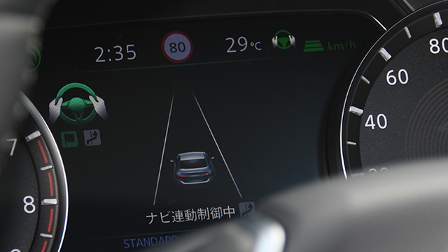 まず、これはセレナと同じだが、ステアリング右下のブルーのスイッチを押す。これで前車追従機能付きクルーズコントロールと同一車線レーンキープ機能が目を覚まし、メーターパネルやヘッドアップディスプレイの各マークがグリーンになる。