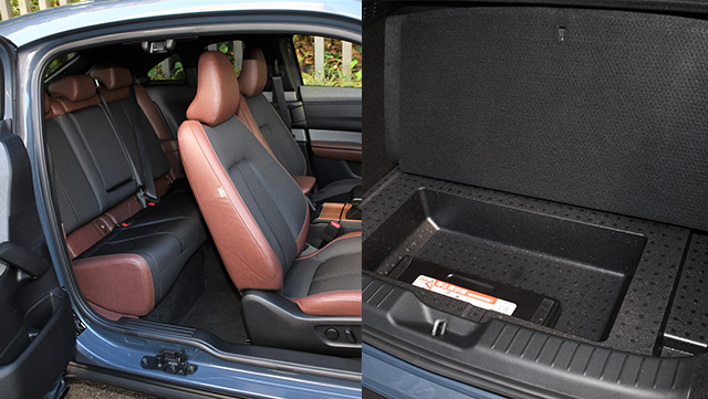 「心が整う室内空間」は、インテリアデザイン全体に対していえることだ。ドライバー主体の室内ではなく、乗っている人たちとの一体感の実現のためのフローティングコンソールや、インパネレイアウト、コンソール周辺、ドアグリップなどへのワインの栓を打ち抜いたあとのコルク端材の活用、ペットボトルのリサイクル材からつくられたフェルト調の素材の不織布のドアトリムへの採用など、環境に配慮した内装材も好感が持てる。総合的なインテリアの質感は同クラスの競合車に比べてかなり高く、ふたクラスほど上の車両といってもよいレベルに仕上がっている。