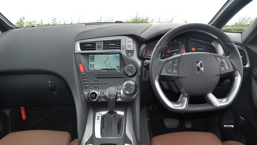 インテリアでも声高に個性を主張する。その主なアイテムは、前席左右と後席上部に設けられたシェード付きの三分割ガラスサンルーフ、航空機風にデザインされた各ブロックのスイッチ群、それと操縦桿に似たフラットボトムのステアリングだ。世のクルマは猫も杓子も運転席をコクピットと表現したがるが、実際にそういう印象を与えるデザインは決して多くはない。そのなかにあってこのDS5の運転席はかなりの“ヒコーキ・キブン”である。