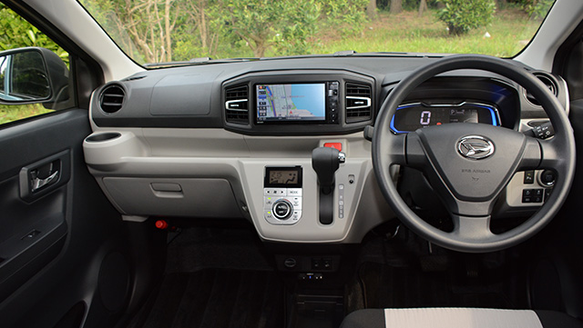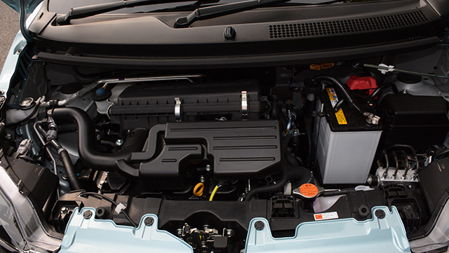 ステアリングを握って走り始めると確かに従来より随分と大人びて感じられる。試乗車は上から2番目の2WD X“SA III”グレード(108万円)だったが、ファブリック地のシートはクッションが意外な厚みを有しており、長めのホイールベース(2455mm)と相俟って軽とは思えないフラットでハーシュネスの少ない乗り心地を提供する。室内はスペース効率が高く、リアシートのレッグルームは充分だ。立体的な造形が特徴のダッシュボードはシボの付け方も巧妙で、この点に関してはいささか平板にすぎるライバルのアルトを確実に凌いでいる。数字では驚きの軽量化だが、その影響は正直言って功罪両面あるようだ。なるほど信号待ちからの発進や中低速域での追い越しがさしたる不満ないまでに改善されたのは初期の狙いどおりであり、歓迎されるが、それでもなお80km/h以上の速度域では依然ややエンジン回転数の頭打ち感が免れず、同時にフロアやスカットルからと思しきロードノイズの侵入が過大なのが惜しいところ。このあたりは適宜遮音材の追加等で生産過程での対処・熟成が比較的容易なはずだ。