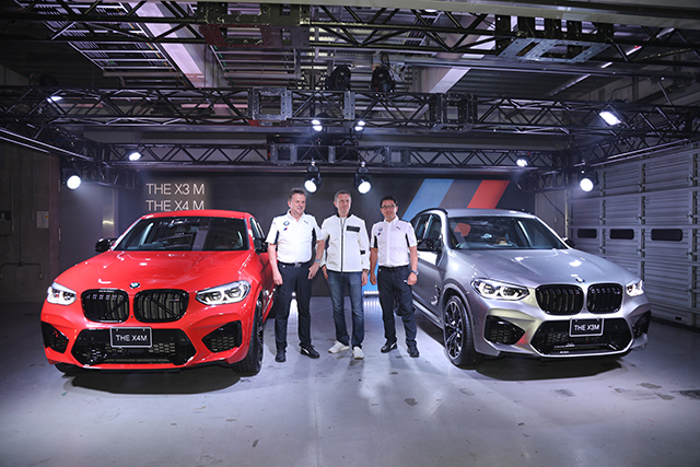 X3MとX4Mの間に代表取締役社長 ペーター・クロンシュナーブル氏(中央)、BMW M Sales&Marketing担当執行役員 ピーター・クィントス氏(左)BMW M Marketing Manager ローター・シュッペ氏(右)