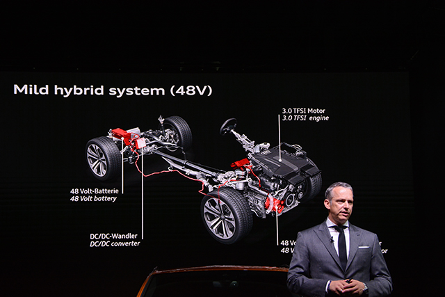 全モデルとも、A8など同様に48Vを電源とするマイルドハイブリッドシステムだ。結果として、22km/hからのエンジンストップとスタートを可能とするとともに、最大で12kWというエネルギー回生能力を備えた。また、緊急時にクルマを自動的に走行車線内に停止させる「エマージェンシーアシスト」をアウディとして初めて装備した。