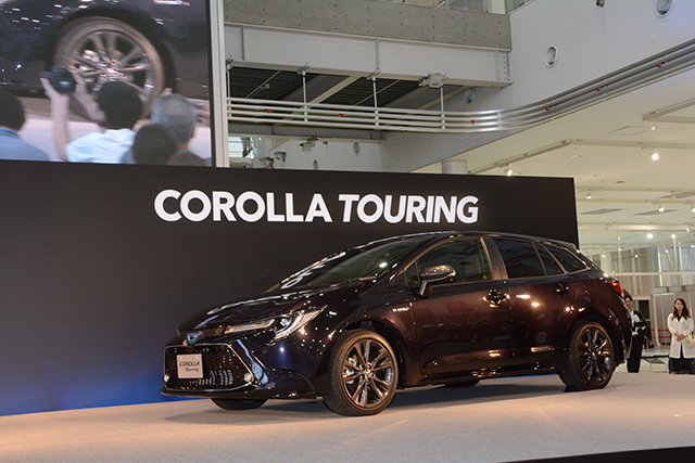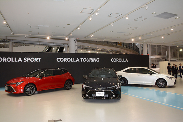 左から、スポーツ、ツーリングワゴン、カローラ。3台ともハイブリット仕様。合わせて月販9400台。
