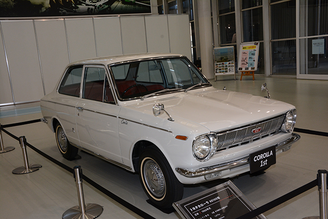 ビッグウエブ会場には歴代カローラを展示。初代カローラが今の軽自動車なみの全幅だったとは!