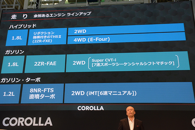 エンジンは3種類。(1)ハイブリッド 1.8ℓ:72kW(98ps)+モーター:53kW(77ps)(2)1.8:72kW(98ps)/103kW(140ps)(3)1.2ℓターボ:85kW(116ps)である。トランスミッションはCVTと電気式無断変速機、それに1.2ℓターボには6速MTも用意依される。