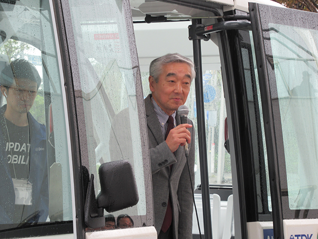 鹿野エグゼクティブ・プロデューサー。自動運転セレモニーの挨拶も。