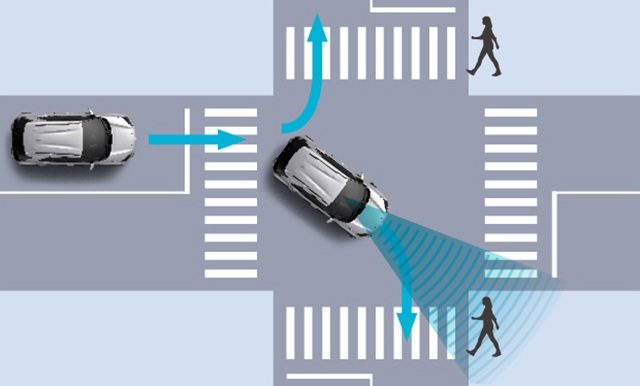 右折時に対向車があると止まるのはよくあるが、右折後の横断歩道の歩行者まで検知するのは親切。