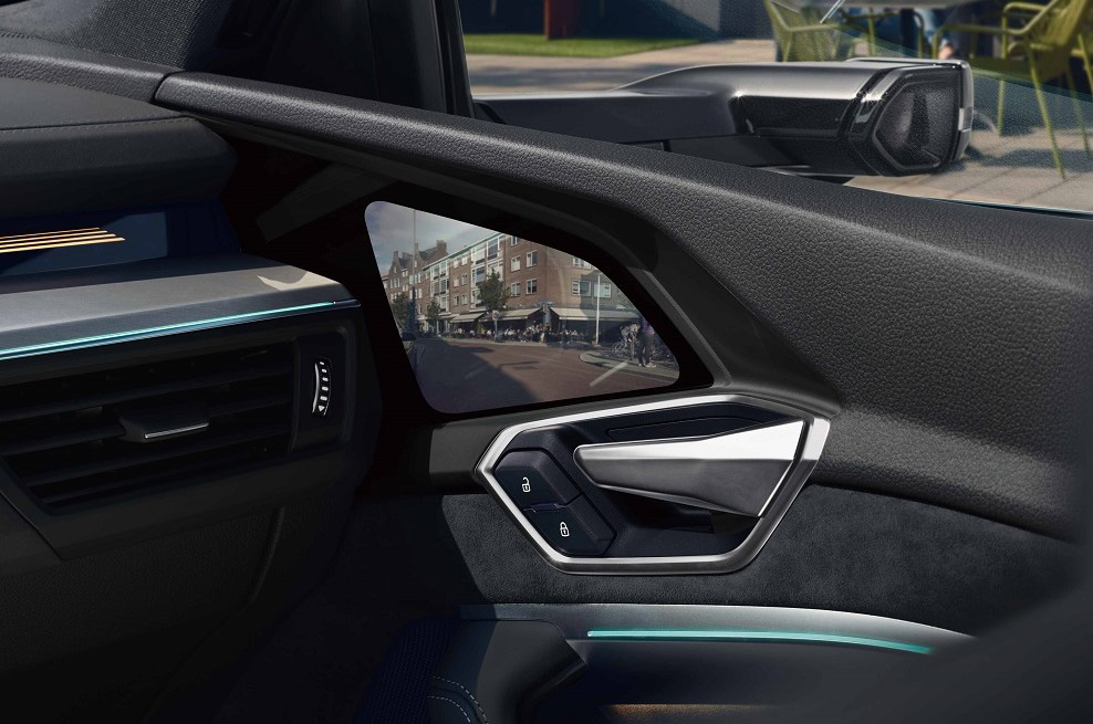 アウディ初の装備として挙げられるのがバーチャルエクステリアミラーである。(他メーカーではすでに採用しているところもある)室外の小型ミラーでサイドの視界をダッシュパネルとドアの間に設置されたOLED(オーガニック・ライト・エミッティング・ダイオード=有機発光ダイオード)に表示する。標準のドアミラーよりもミラーハウジングがスリム化でき空気抵抗が減る。CD値は0.25。ただ、素人目にはもっとボディに近づけた方がいいと感じるが、視界を確保するためにはこの程度ボディとの距離保つ必要があるとのことだ。