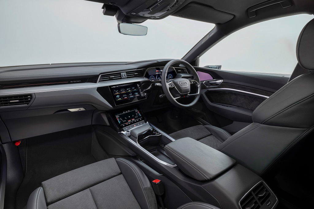 エクステリアの特徴は同社のQファミリーを表すオクタゴン(八角形)シングルフレームグリル。ただし他のQファミリーと区別するべくフレーム部をプラチナグレーとし、さらに下部にe-tronのロゴを配している。サイドでは低く弧を描くルーフラインがクーペSUVを、前後のブリスターフェンダーがクワトロのイメージを引き継ぐ。