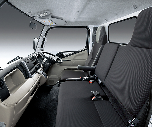 キャンター2016モデル。低燃費化が図られるとともに、ドライバーが多くの時間を過ごすキャビンの快適化と疲労の軽減が図られている。