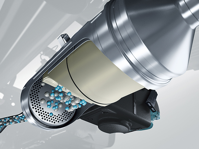 NOxに対してはアドブルー(尿素水)による尿素SCR(NOx還元触媒)で確実な低減処理を行なっている。写真はその尿素噴射のイメージ。