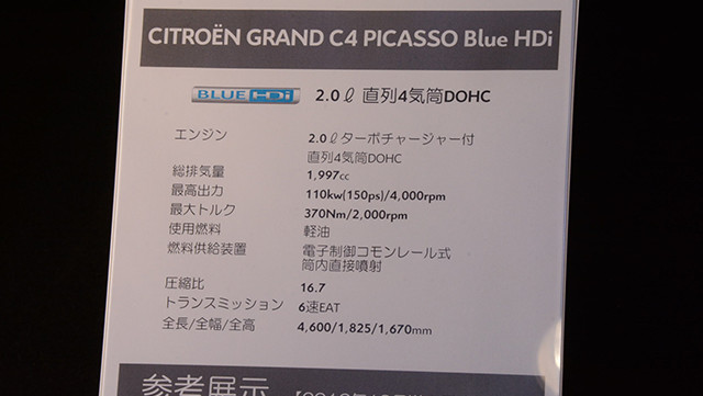 この12月に導入予定のピカソの看板。エンジンは150馬力の2.0リッター4気筒ディーゼルターボだ。