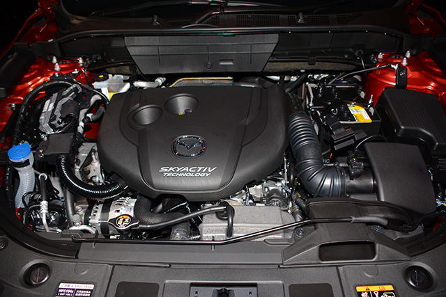 CX-5のディーゼルエンジンもCX-3の技術を引き継ぐ。搭載エンジンはディーゼルが1種類とガソリンが2種類だ。ディーゼルは2.2ℓ(129kW=175ps)、ガソリンは2.0ℓ(114kW=155ps)、2.5ℓ(135kW=184ps/140kW=180ps)。このディーゼルもCX-3のエンジンと基本的には同じシステムを採用している。ディーゼルの420Nmという最大トルクは魅力がある。