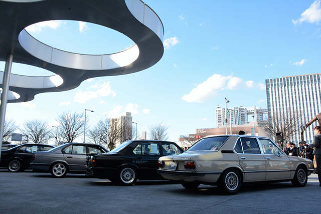 会場のBMW GROUP Tokyo Bayには、Mスポーツを中心に歴代の5シリーズが並べられていた。手前は初代の520(73年製)。このときの全幅は1690mmだった。