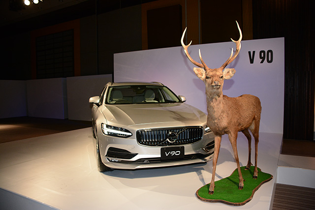 ボルボは発表会場にエゾジカのはく製まで持ち込んだ。細い角とか動きの問題もあって完全に対応するのは難しいらしい。北欧では深刻な問題だ。