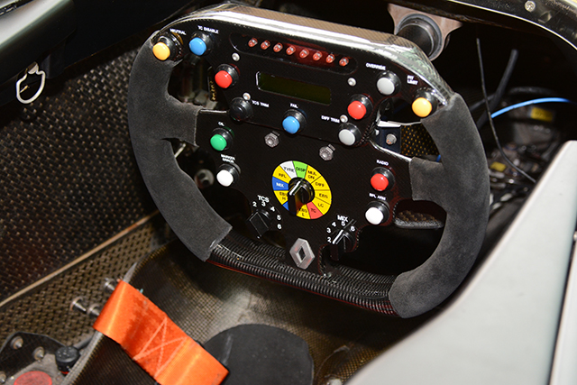 発表会にはルノーのF1マシンも展示された。そのステアリングはこんなに小さく派手だ。