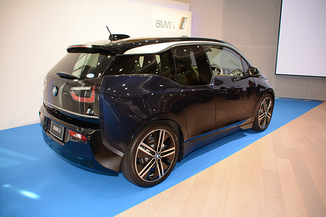 サイドの変化はルーフサイド。前から後ろまでクロームの加飾が付いた。これによって、どちらかというと変わり者で真面目な公務員のようなi3の印象が少し和らいだ。リアもバンパー形状が微妙に変わると同時にエンブレムの下にクロームのラインが入った。