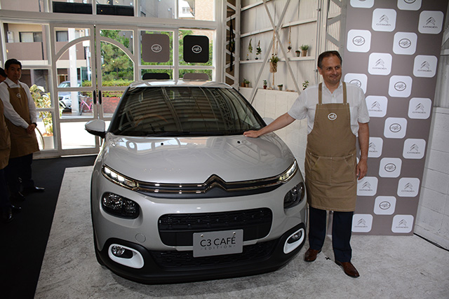 カフェ・エディションの発表会らしく関係者全員がお店のエプロンを着てプレス対応。嬉しそうにプレゼンテーションをしたのはプジョー・シトロエン・ジャポンのクリストフ・プレヴォ社長。