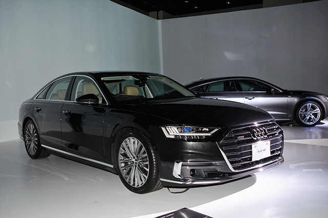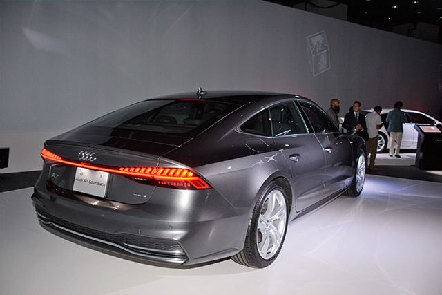 手前がA8、後ろがA7スポーツバック。ともにスタイリッシュだ。旧A7はデザイン的にも注目だった。