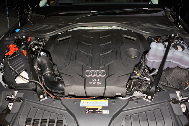 エンジンはA8が3リッターV6直噴ターボ(250kW)と4ℓV8ターボ(338kW)。A7は3リッターV6ターボだけだ。このエンジンにはマイルドハイブリッドシステム(MHEV)が装備された。その中心となるのは48Vの小型リチウムイオン電池とクランクシャフトに直結したベルト駆動のオルタネーターから構成される。22km/h以下でのエンジン停止ができコースティング(惰行走行)の距離が増える。この結果100kmあたり0.7ℓの燃費節約になるという。回生エネルギー能力も向上した。